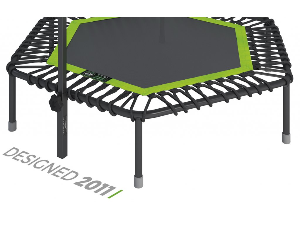 - Opěrné madlo: Je vyrobené z jeklového profilu o tloušťce 2 mm. Výhodou je variabilní nastavení dle výšky skákajícího a následná fixace v požadované výšce pevným aretačním šroubem. Držák na opěrné madlo je k trampolíně pevně přivařen, takže po vsunutí madla nedochází k nepříjemným a nebezpečným otřesům. Horní část opěrného madla je lehce zaoblena pro větší komfort při skákání.