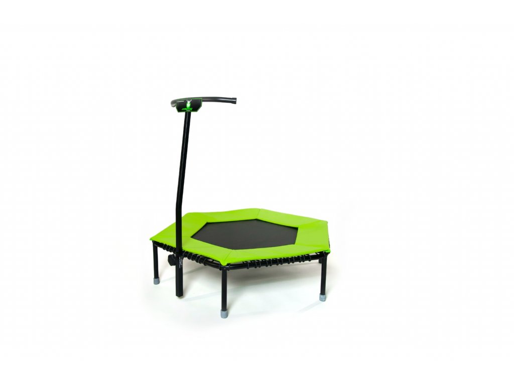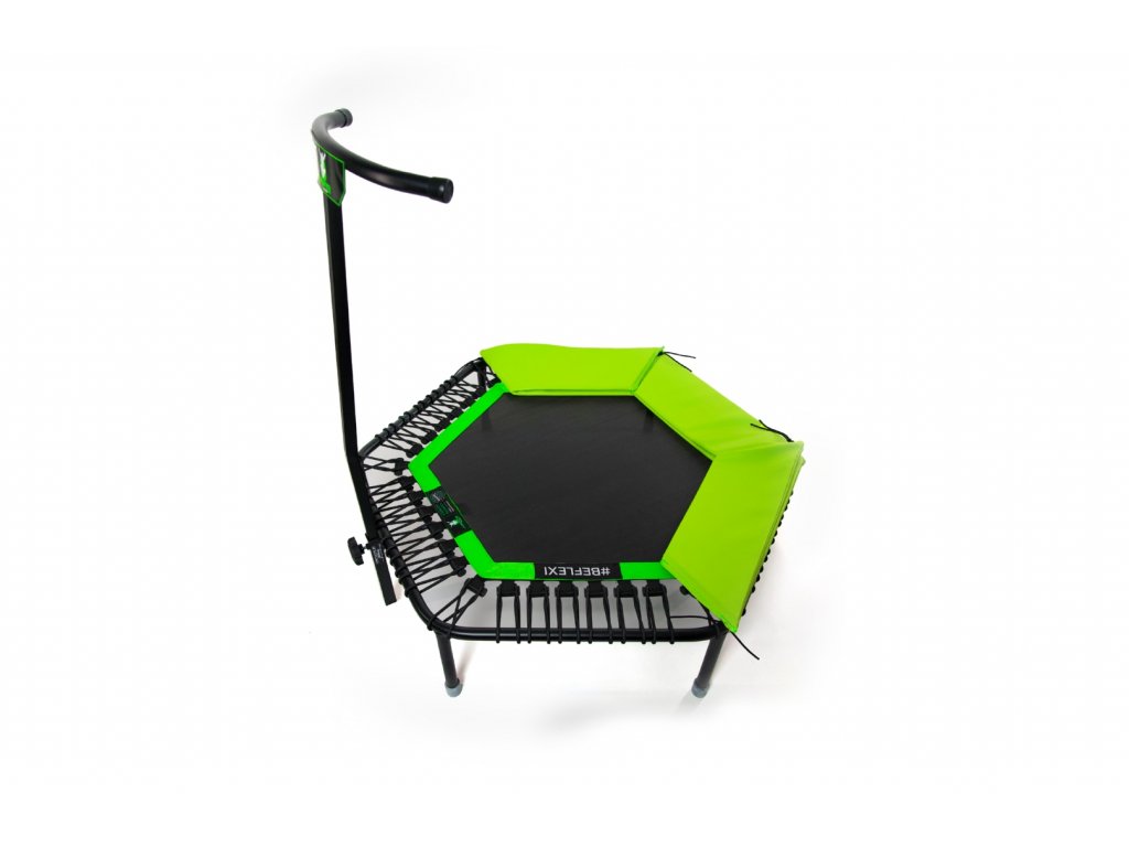 Opěrné madlo: Je vyrobené z jeklového profilu o tloušťce 2 mm a dají se variabilně nastavit dle výšky skákajícího s následnou fixací pevným aretačním šroubem. Vychytávkou je naklonění opěrného madla nad doskočený výplet, díky tomu je skákání na této trampolíně komfortní i pro ty nejmenší. Držák na opěrné madlo je k trampolíně pevně přivařen, takže po vsunutí madla nedochází k nepříjemným a nebezpečným otřesům. Horní část opěrného madla je lehce zaoblena pro větší komfort a bezpečnost při skákání.