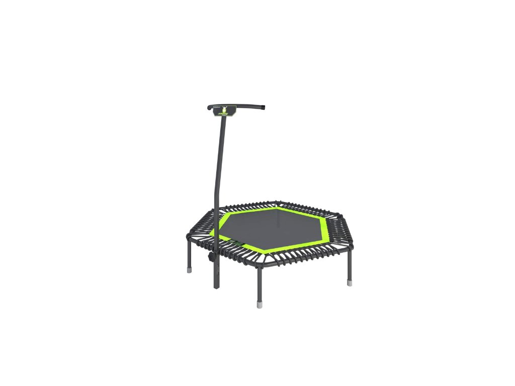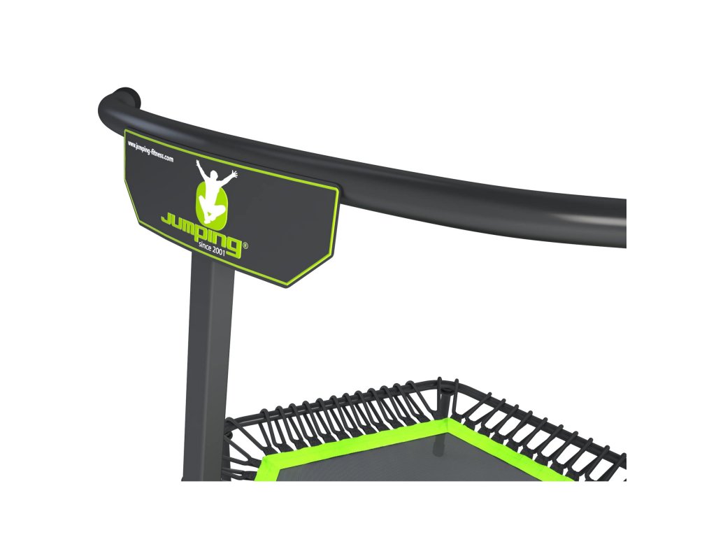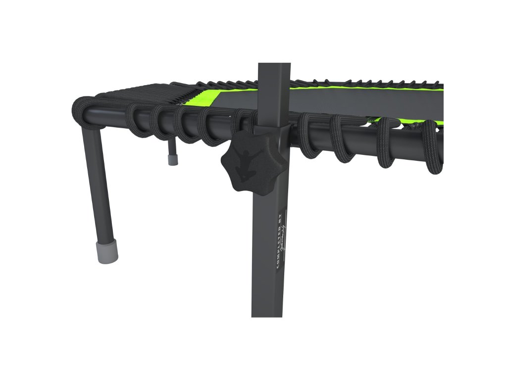 - Opěrné madlo: Je vyrobené z jeklového profilu o tloušťce 2 mm. Výhodou je variabilní nastavení dle výšky skákajícího a následná fixace v požadované výšce pevným aretačním šroubem. Držák na opěrné madlo je k trampolíně pevně přivařen, takže po vsunutí madla nedochází k nepříjemným a nebezpečným otřesům. Horní část opěrného madla je lehce zaoblena pro větší komfort při skákání.